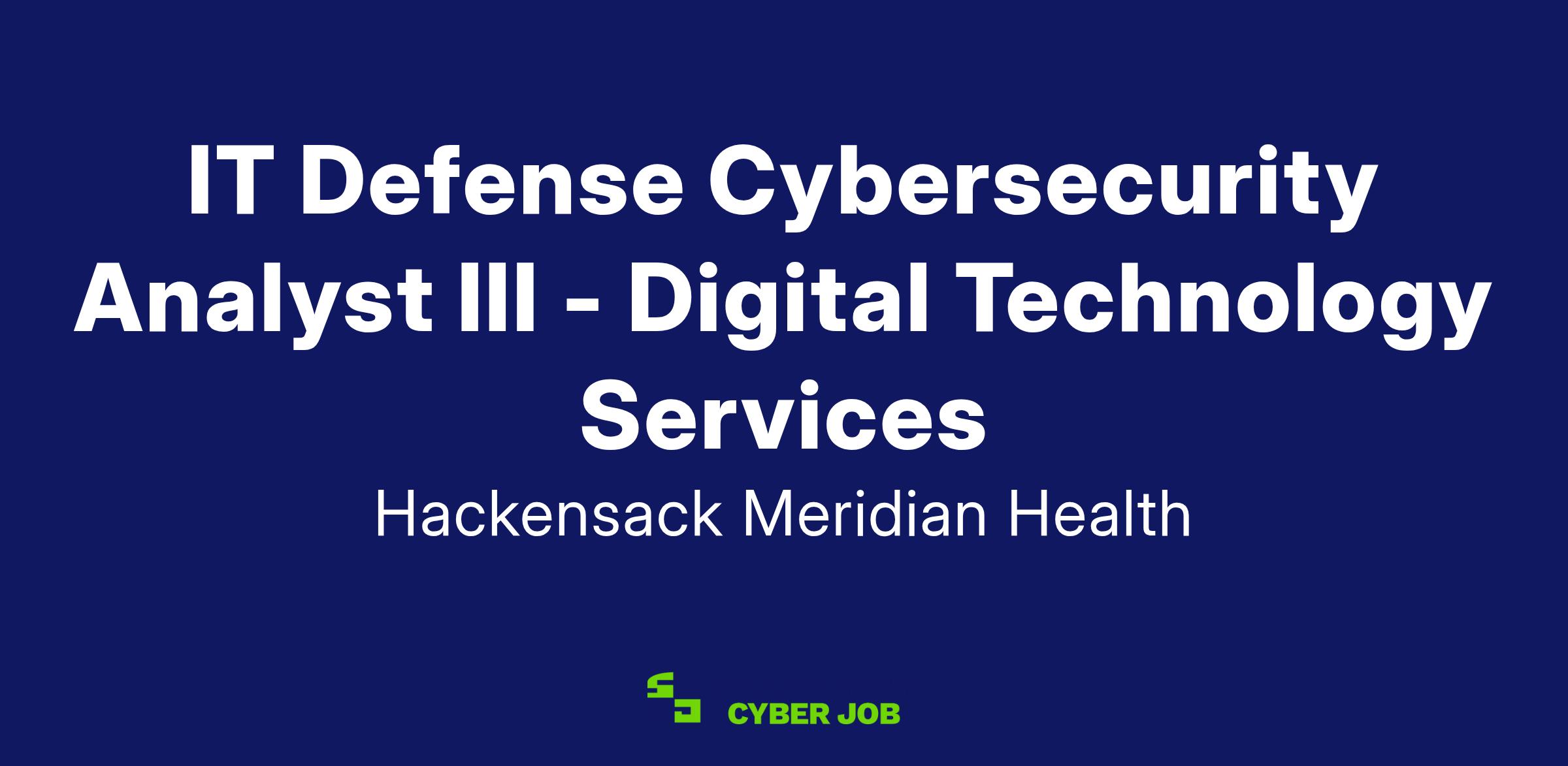 The Defense Cybersecurity Analyst III is responsible for effective monitoring, detection, analysis, and response to cybersecurity events and incidents to protect Hackensack Meridian Health¿s (HMH) systems and data. Analyze cybersecurity events, investigate incidents, implement and maintain cybersecurity tools, and provide technical expertise to support cybersecurity operations. Involves collaboration with other Digital Technology Services (DTS)/Information Technology (IT) teams and cybersecurity vendors to contribute to efficient cybersecurity operations and incident handling.